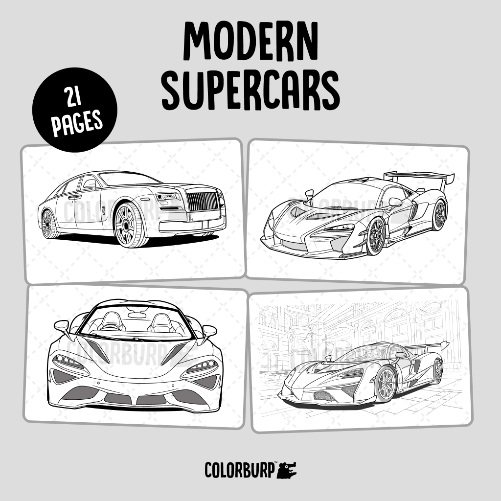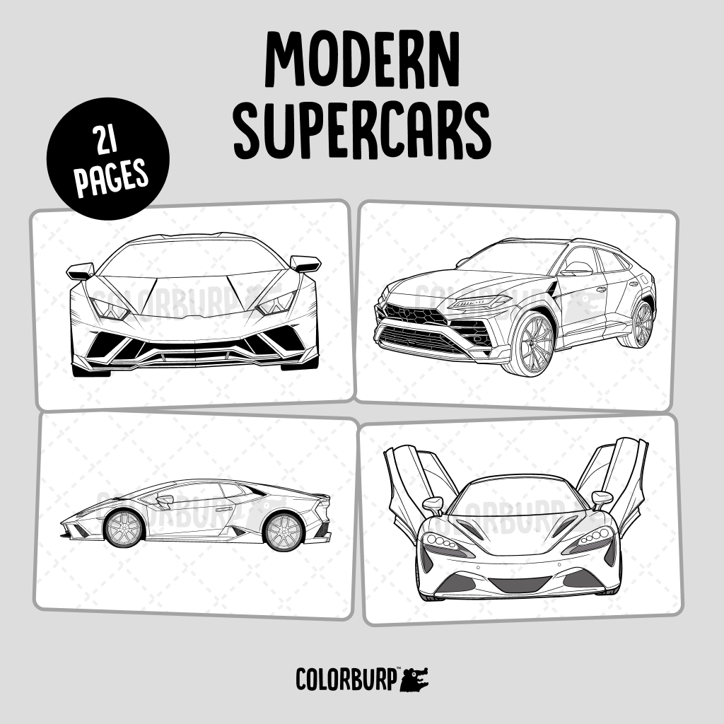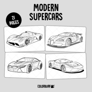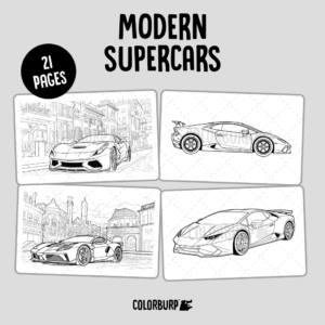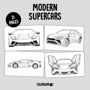 Step into the world of Modern Supercars – a premium collection of 20+ high-resolution coloring pages featuring original designs inspired by the most iconic performance machines on earth. Influenced by the formidable modern lines of cars by companies such as Lamborghini and Ferrari and Porsche, every illustration captures the art and engineering of modern automotive perfection.